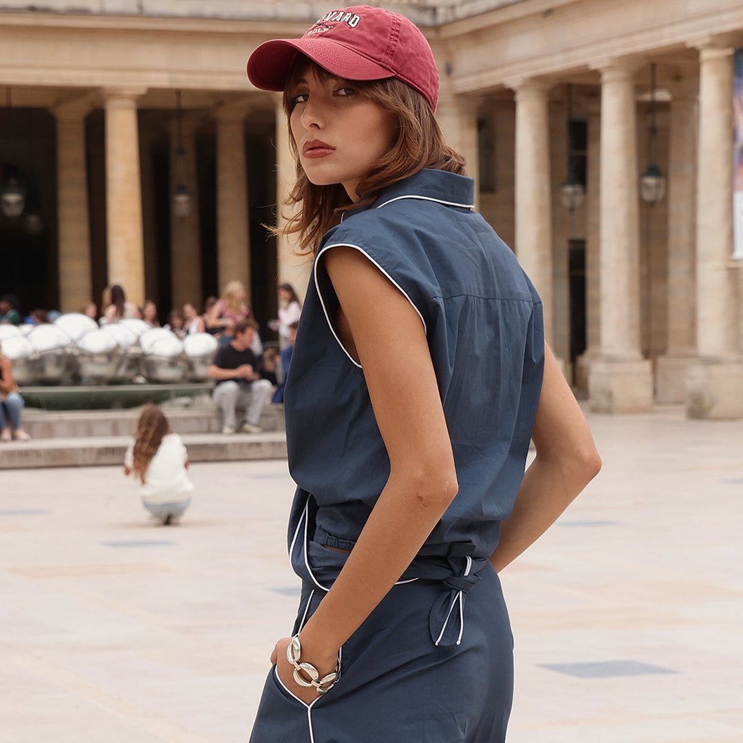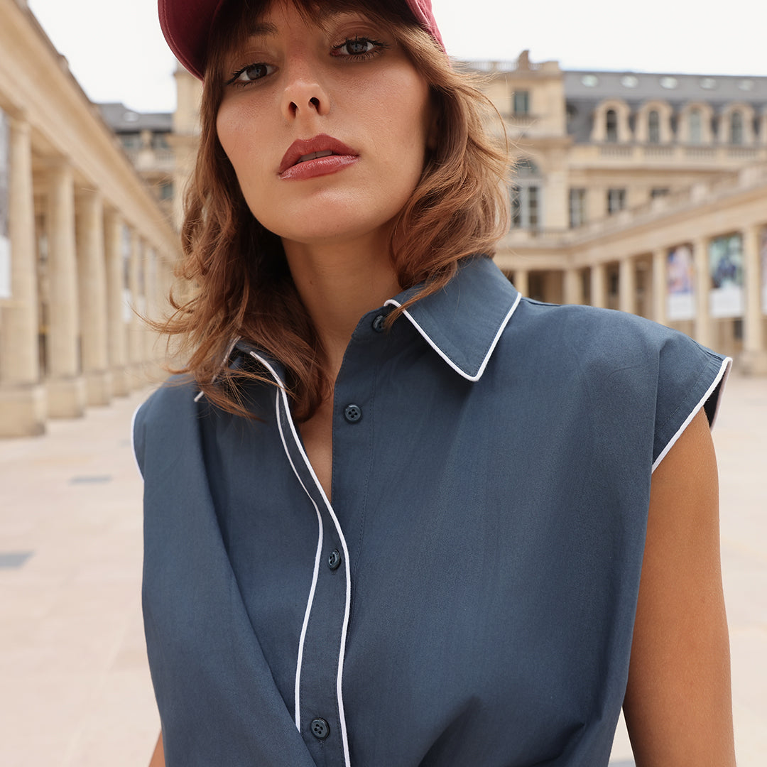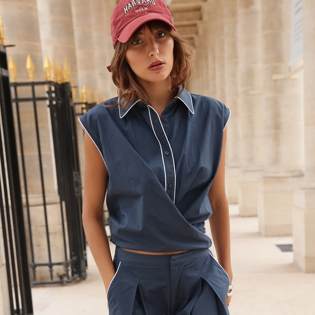 Crafted from breathable cotton poplin in a rich navy hue, the Cisco Shirt features relaxed tailoring and a contemporary wrap-front silhouette. Crisp white piping outlines the collar and seams, bringing soft definition, while tonal navy pearl buttons offer a refined finishing touch. The sleeveless cut enhances its lightweight feel, making it perfect for warm days or effortless layering throughout the seasons.
