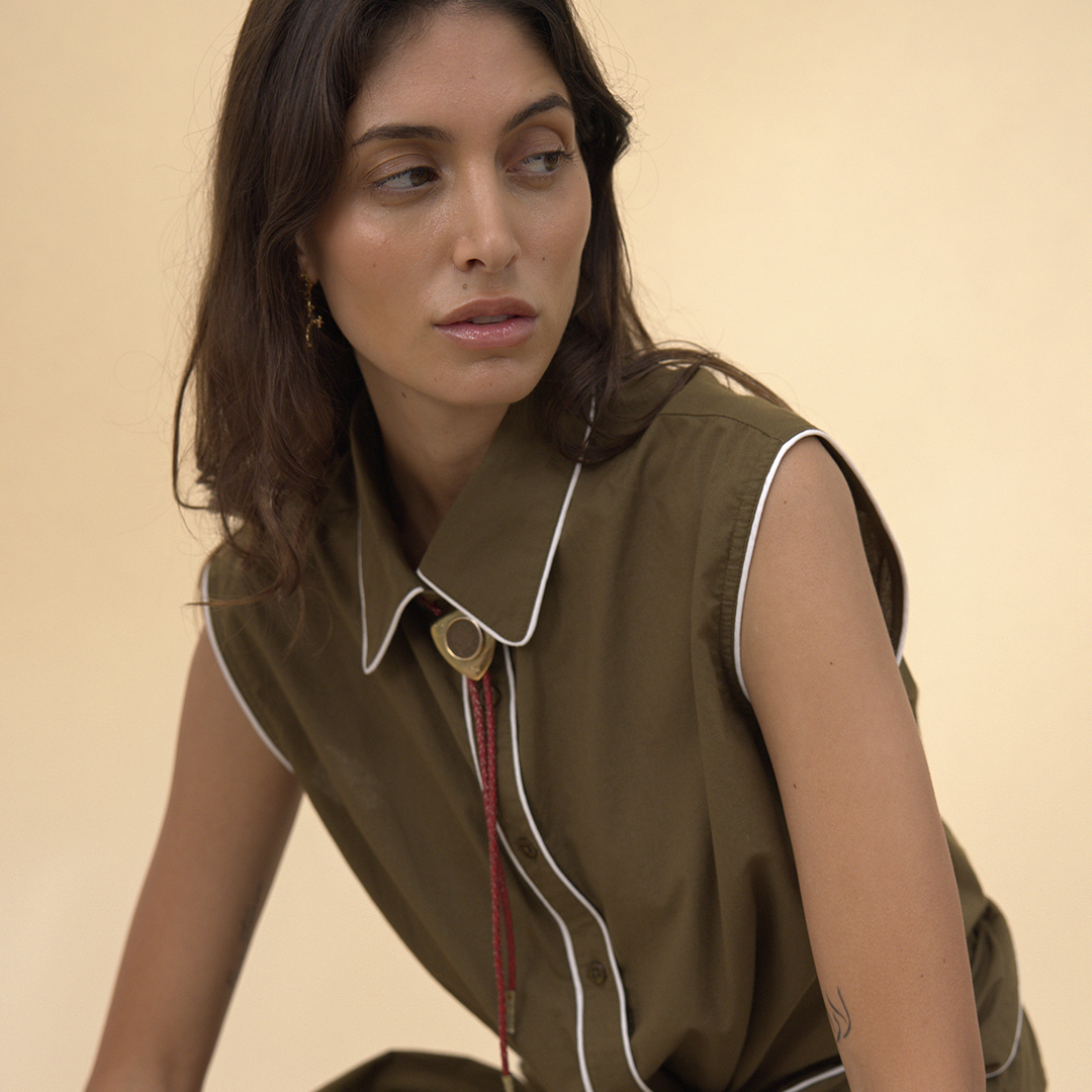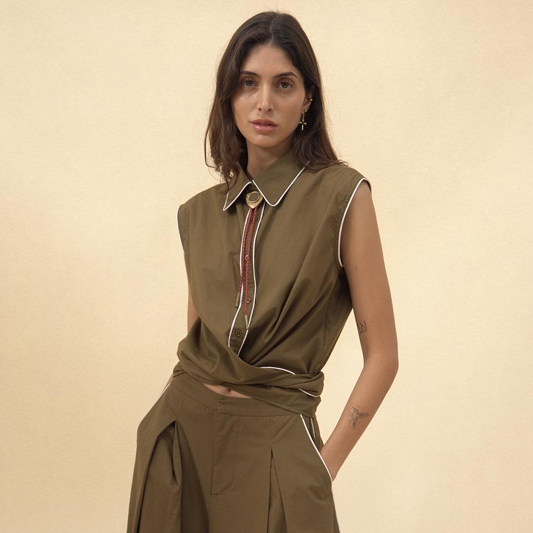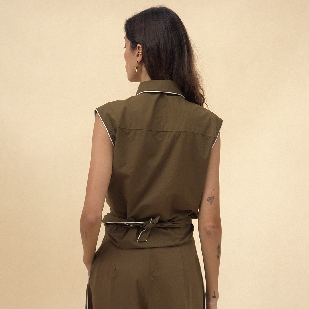 Crafted from breathable cotton poplin in a rich olive hue, the Cisco Shirt features relaxed tailoring and a contemporary wrap-front silhouette. Crisp white piping outlines the collar and seams, bringing soft definition, while tonal pearl buttons offer a refined finishing touch. The sleeveless cut enhances its lightweight feel, making it perfect for warm days or effortless layering throughout the seasons.