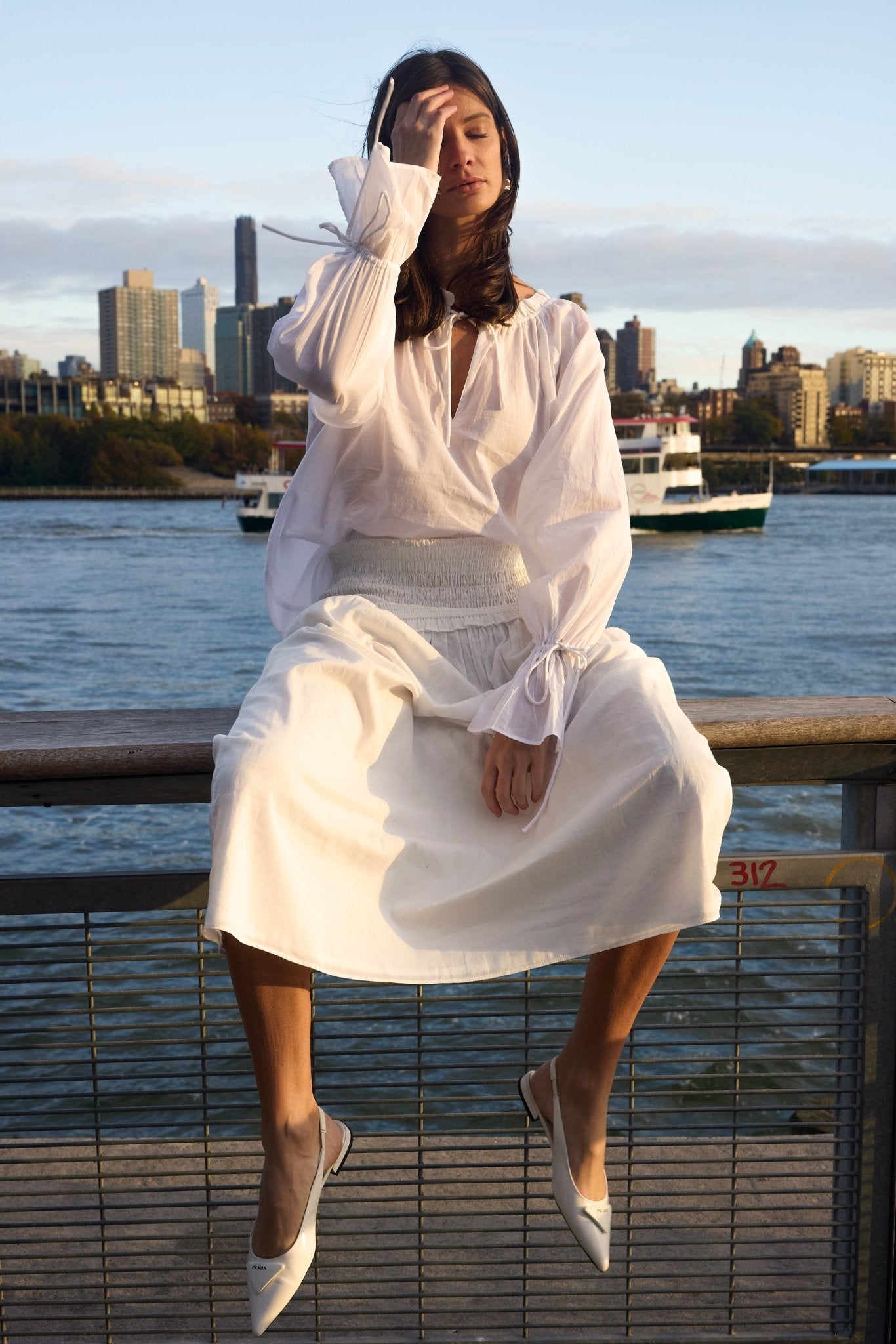A softly romantic blouse crafted from lightweight cotton voile with a beautiful, fluid drape. Designed to move effortlessly from resort ease into bohemian urban styling, the Flo Ruffle Long Sleeve Blouse brings a whimsical softness to everyday layering. Breathable, light to pack, and easy to wear — a versatile piece that elevates denim, tailoring, or relaxed resort looks.
