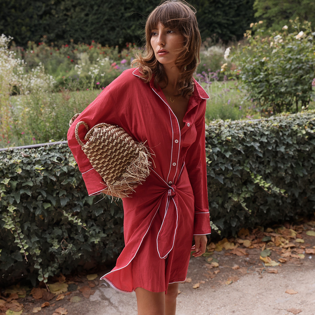 Striking in silhouette yet easy in spirit, the Oli Sarong Dress brings effortless polish with a playful twist. Designed in a rich raspberry hue with crisp white piping, this relaxed-fit shirt dress features a fluid sarong-style wrap detail that nods to both classic tailoring and soft drape. Delicate embroidery of the signature coral motif on both cuffs adds a thoughtful, refined touch.
