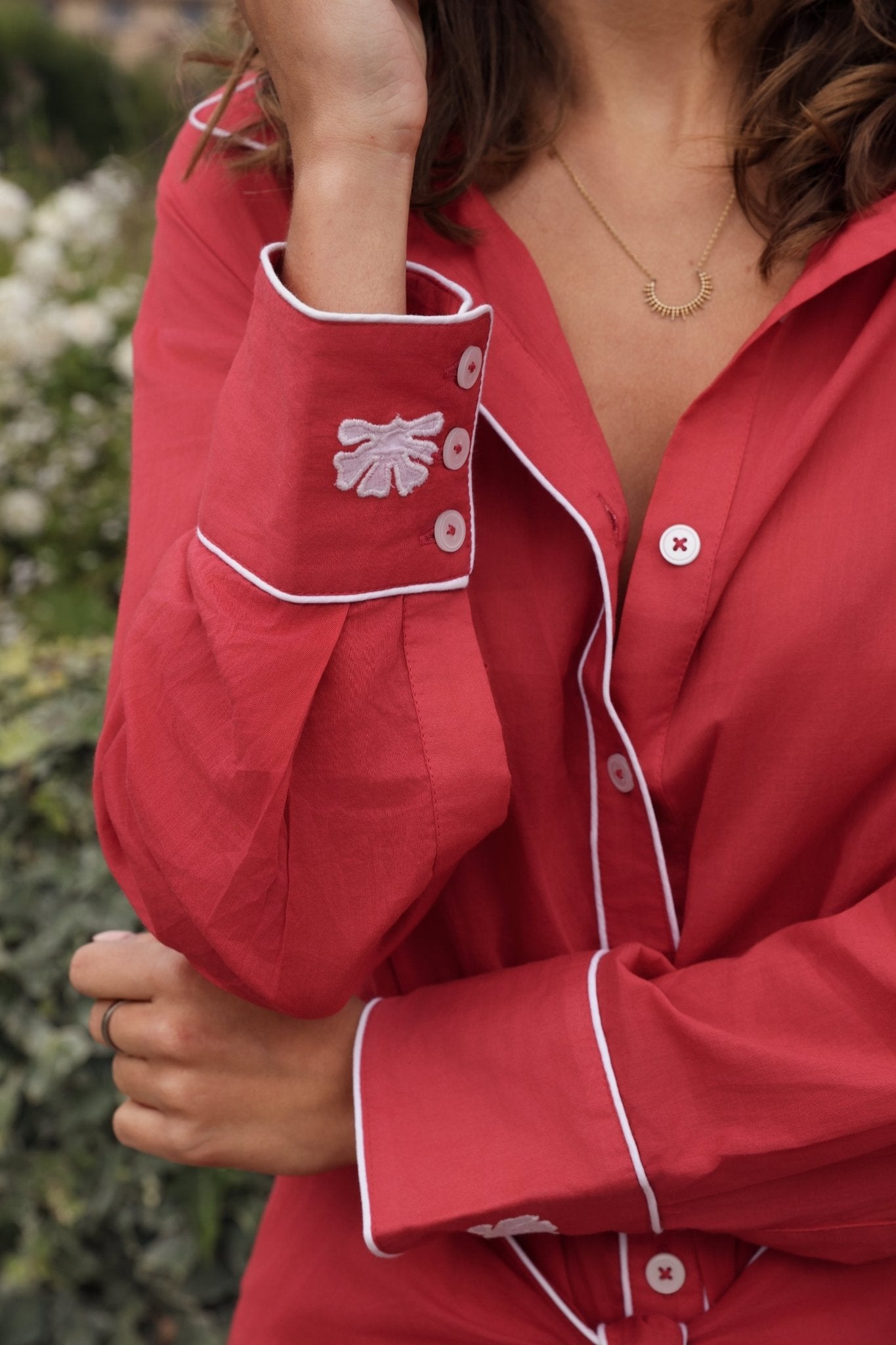 A rich raspberry hue with crisp white piping is elevated by the signature coral motif delicately embroidered on each cuff.
