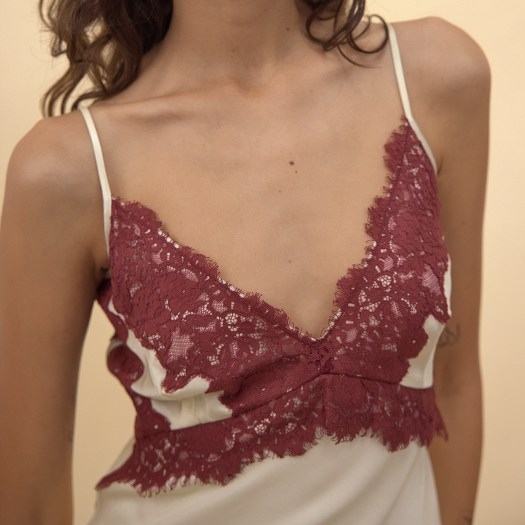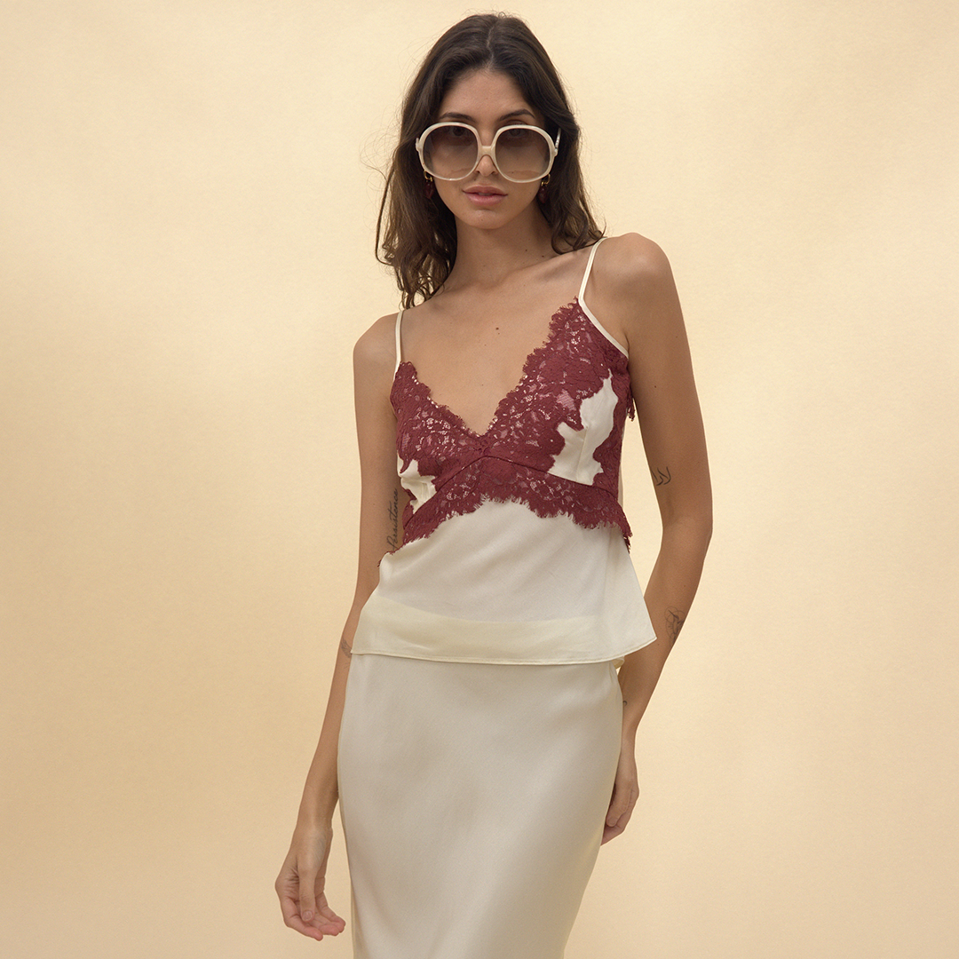 A refined spaghetti-strap top designed with a softly sculpted silhouette and an ultra-smooth satin hand-feel. Gently fitted through the bust with delicate lace detailing, it works effortlessly styled as a set with the Lace Hem Bias Skirt or paired back with denim or tailored pants for everyday polish. Understated yet expressive, this is a versatile staple made to elevate both day and evening looks.