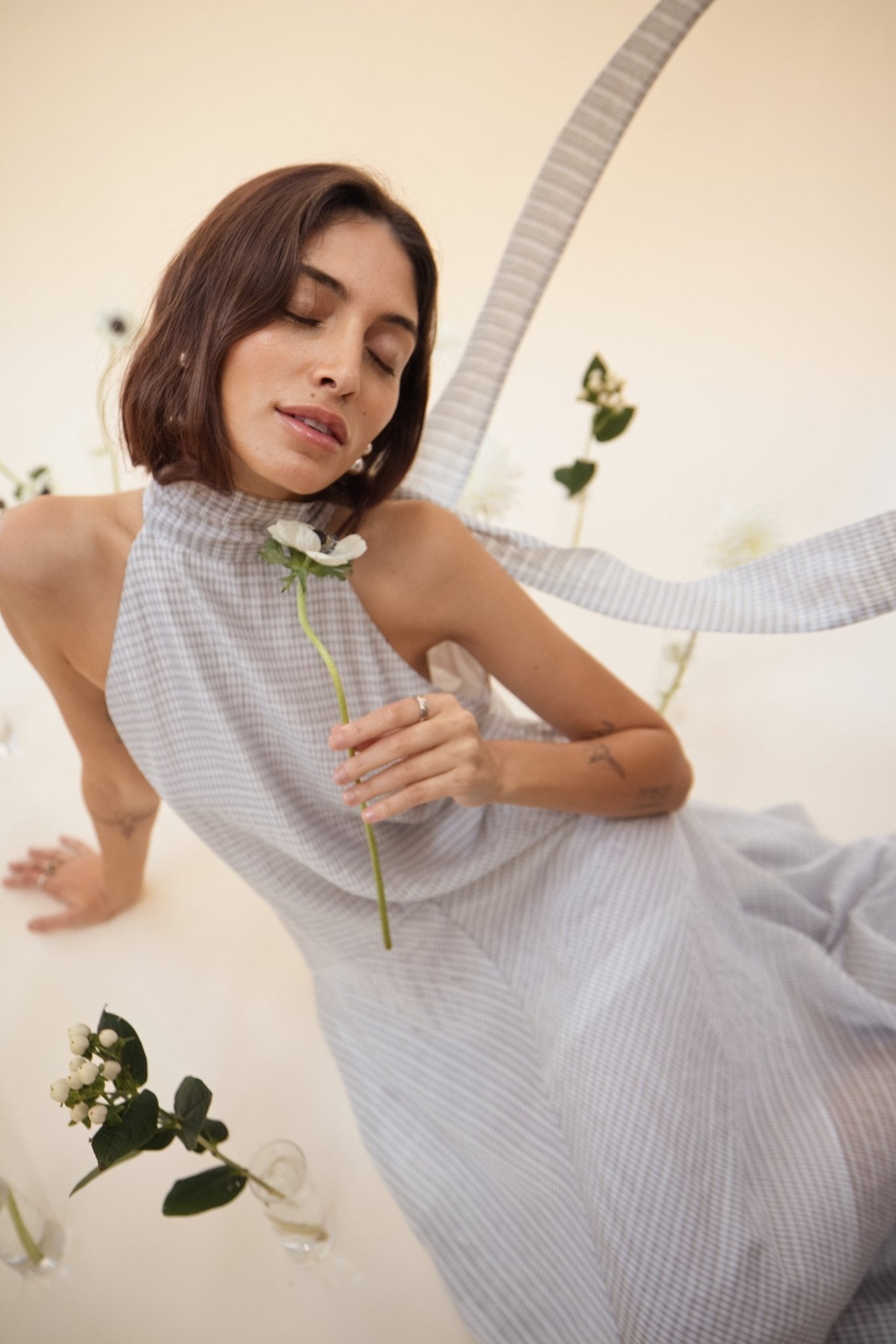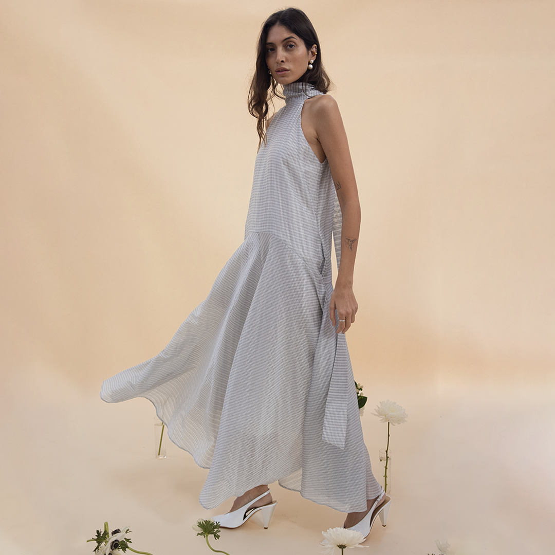 Designed to make an entrance, the Victoria Dress is a striking halter maxi defined by fluid movement and graphic contrast. Cut with a clean, elongated silhouette and a self-tie neckline, it balances statement presence with refined ease—perfect for occasions where impact feels effortless. A special-edition piece that commands attention while remaining timeless.