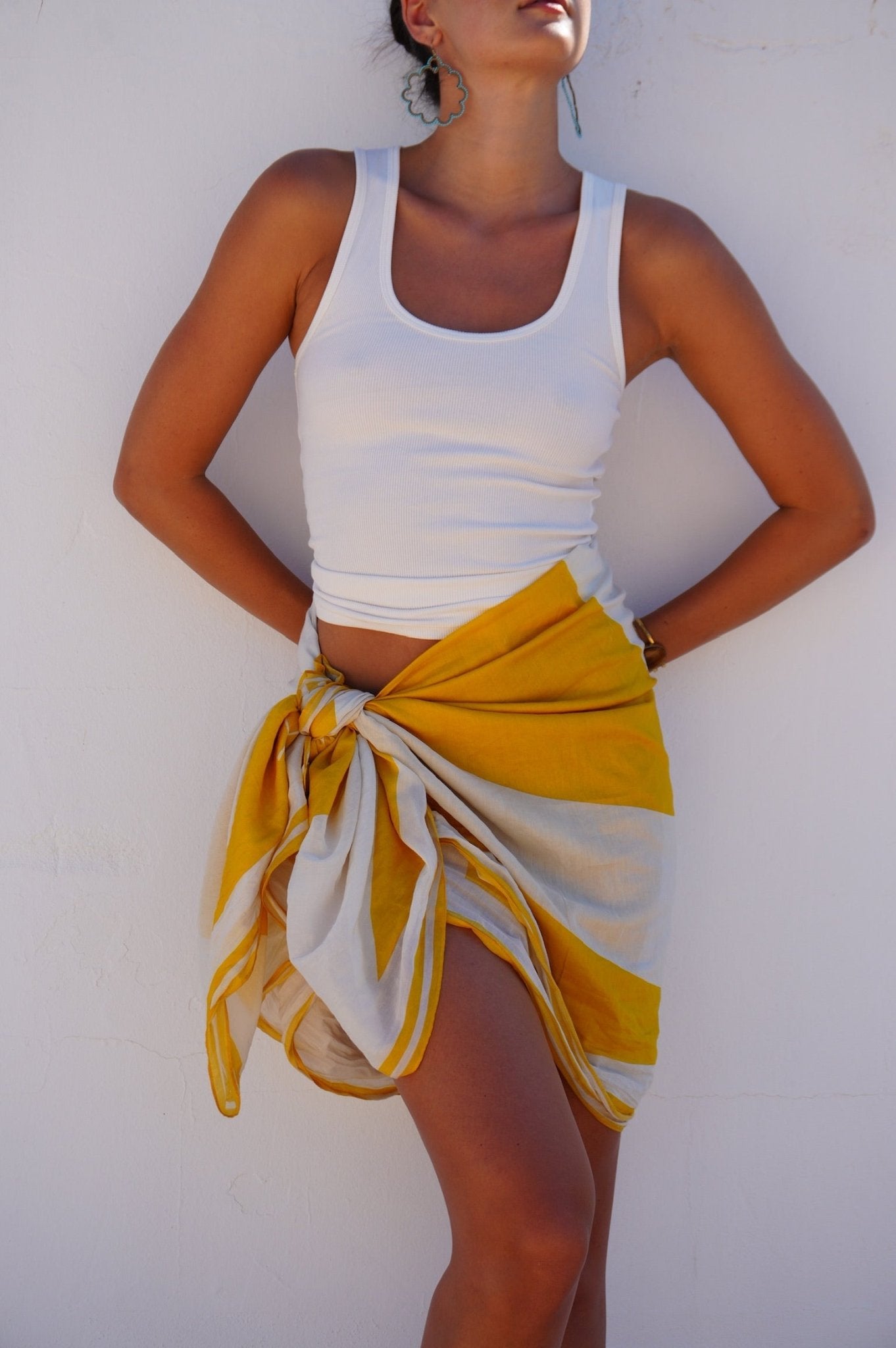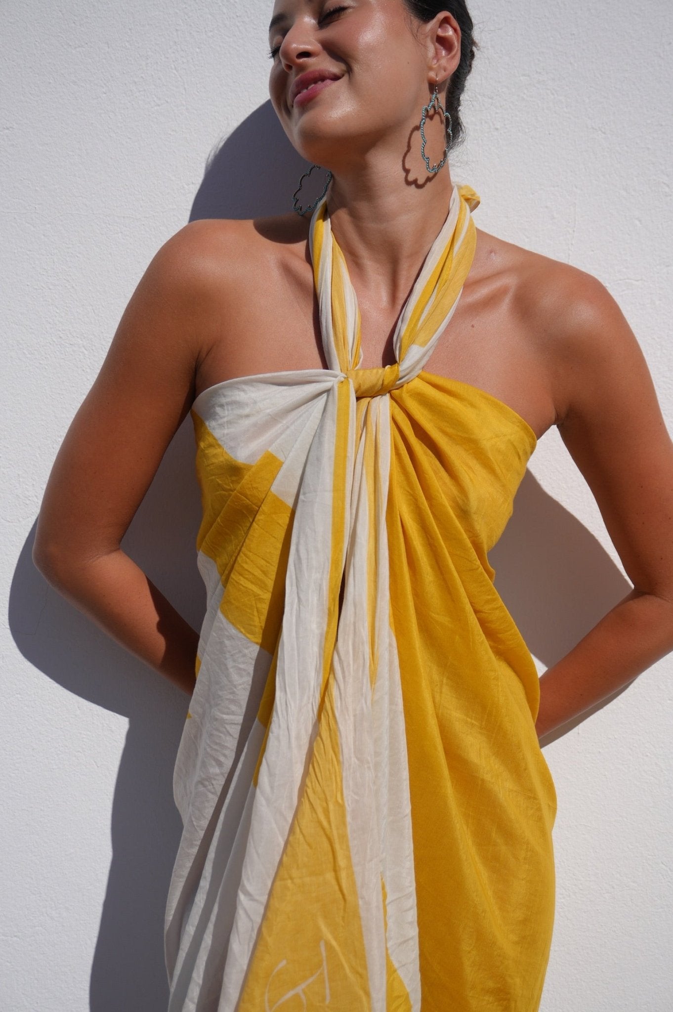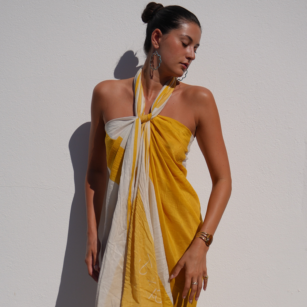 Framed in vibrant yellow and crafted in a featherlight silk-cotton blend, this extra-large pareo is made for effortless resort dressing. Wear it as a halter dress, beach wrap, yellow sarong, or scarf- this versatile piece belongs in every sunshine wardrobe.